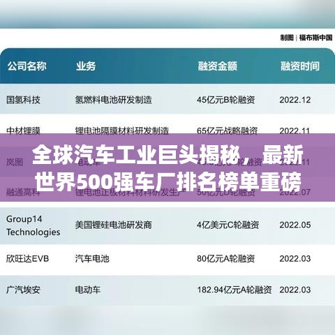 隨著全球汽車(chē)產(chǎn)業(yè)的飛速發(fā)展,各大車(chē)廠的競(jìng)爭(zhēng)也日益激烈,在此環(huán)境下,世界500強(qiáng)車(chē)廠排名榜應(yīng)運(yùn)而生,為公眾揭示了全球汽車(chē)工業(yè)巨頭的實(shí)力與地位,本文將為您詳細(xì)介紹這一排名榜的背后故事,以及各大車(chē)廠的亮點(diǎn)。